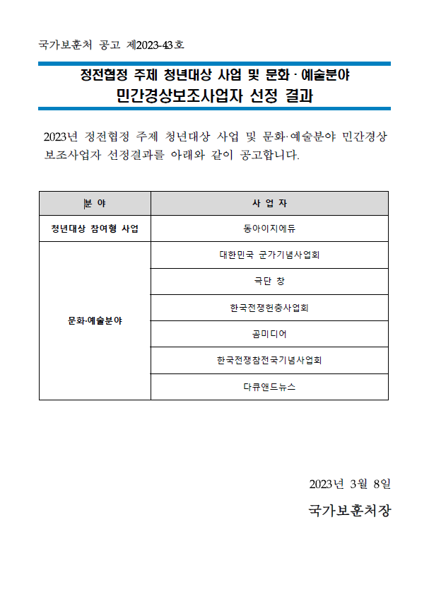 정전70주년을 맞이하여 국가보훈처에서 공모한 국가보훈처 "정전협정 주제 문화/예술분야 민간경상보조사업자"로 선정.